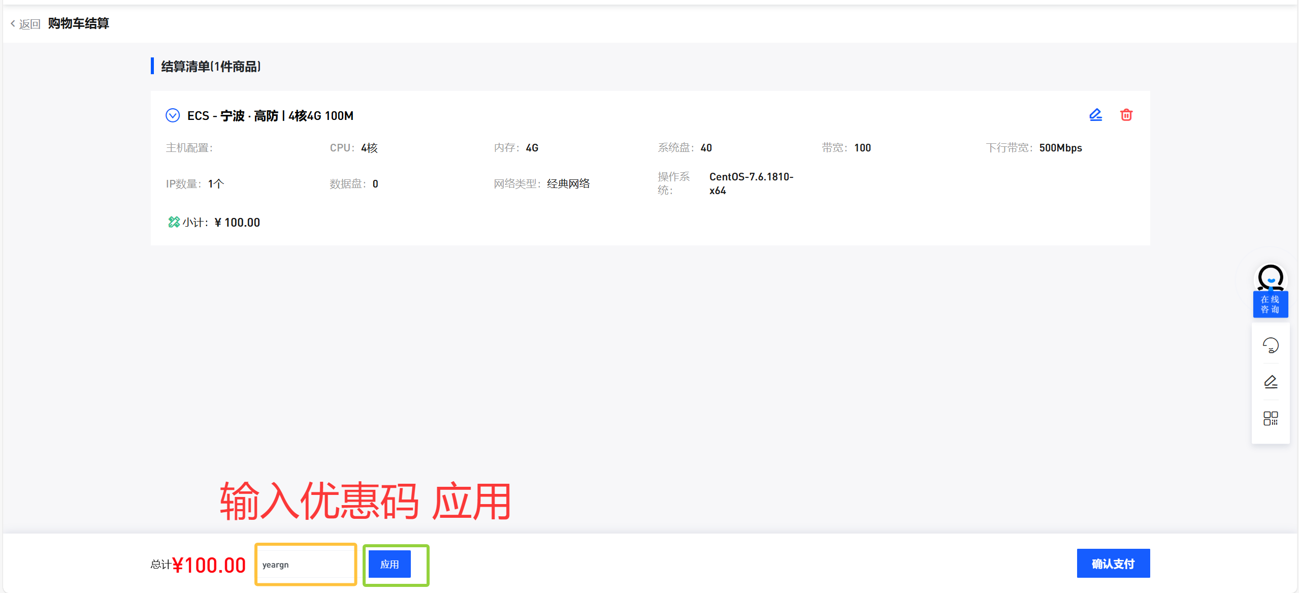 2.加入购物车在左下角框内输入优惠码并应用即可